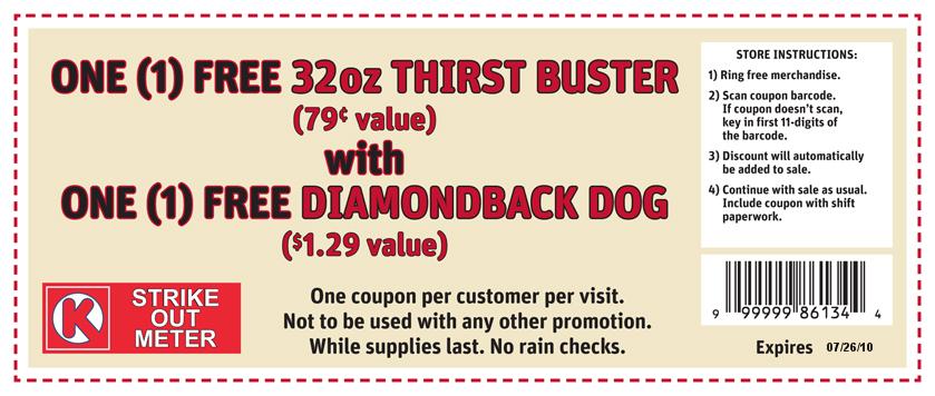 Free 32 oz. Thirst Buster and Diamondback Dog for lunch! Print now, remember to print 2 extra ones to share with your friendly cashiers! They will love you for it!http://http://www.circlekaz.com/printpage.aspx?type=coupons